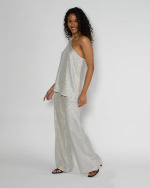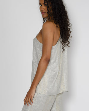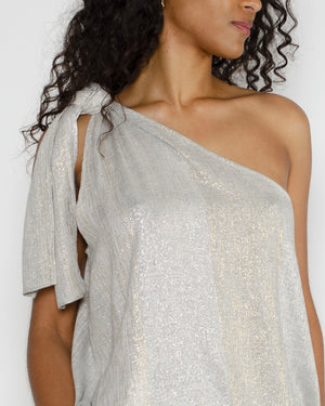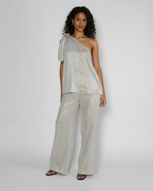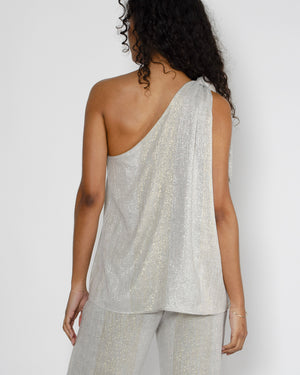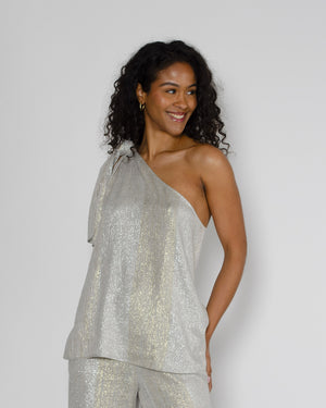 Un top Tava de couleur dorée de la marque Diega. Ce top possède une seule bretelle avec un nœud, il est fluide et léger. On est fan de ce top doré parfait pour les looks des soirs d'été. On aime porter ce top avec le pantalon Portorico assorti, pour un full look gold.