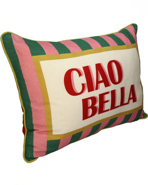 On adore ce coussin en coton multicolore Ciao Bella pour son format 40x60 cm et son message plein de charme. Parfait pour une touche cosy et stylée dans votre intérieur !
