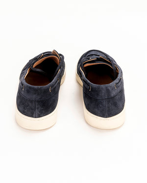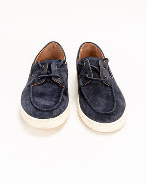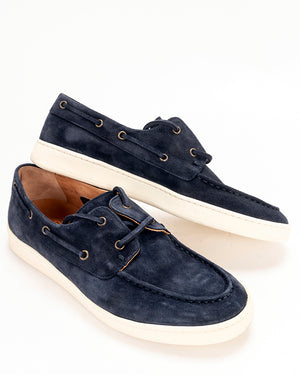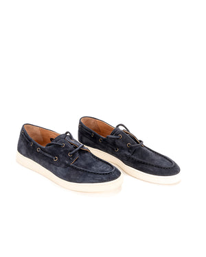 Les indispensables chaussures bateau en cuir suédé bleu marine et semelle en caoutchouc blanc.