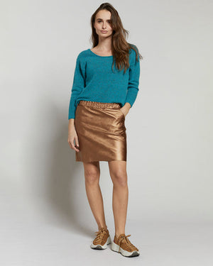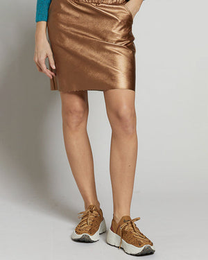 Une jupe en cuir vegan pour femme de la marque Maevy Concept. Coup de coeur pour cette jupe en cuir vegan de couleur cuivre, l'allié pour les soirées d'été !