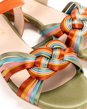 Sandales en cuir olive et orange avec une jolie bride nouée en satin recyclé multicolore à l'avant qui donne de l'élégance.