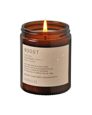 Appréciez le parfum dynamisant de la bougie Boost. Une bougie de la marque Fariboles qui réveille la vivacité du fruit de la passion, arrondie par la délicatesse du gingembre. On adore son parfum enrichi aux huiles essentielles.