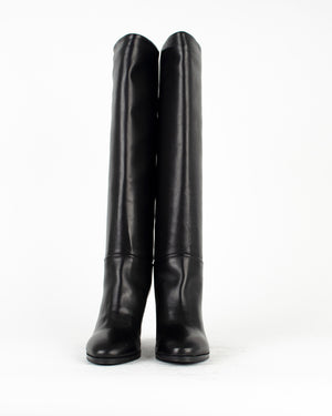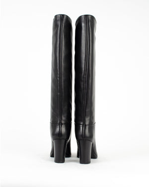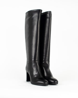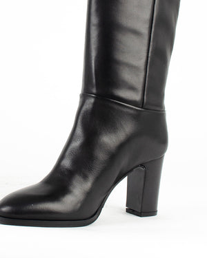Des bottes hautes noires en cuir lisse pour femme de la marque Julie Dee. On adore cette paire de bottes hautes à haut talon noir, elles sont confortables, chics et féminines ! Une paire de bottes basiques faciles à assortir au quotidien !