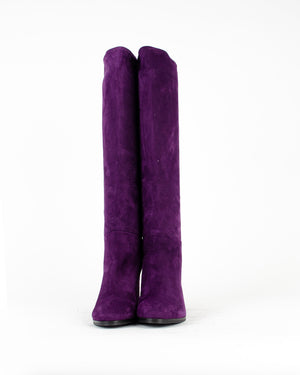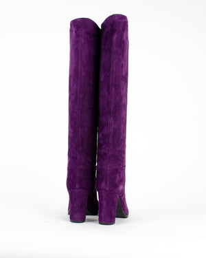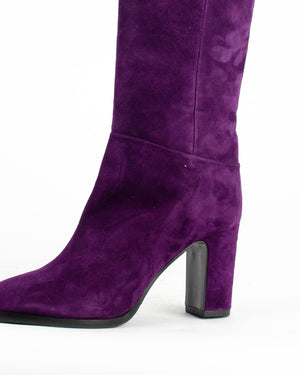 Des bottes hautes violettes en cuir suédé pour femme de la marque Julie Dee. On adore cette paire de bottes hautes à talon en cuir suédé violet, elles sont confortables, chics et féminines !