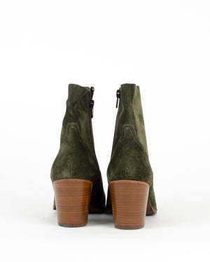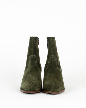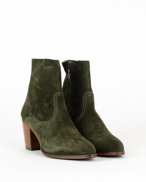 Des boots à talon pour femme en cuir suédé vert et de la marque Aliwell. On adore ces boots à talon en bout pointu pour un look chic et féminin !