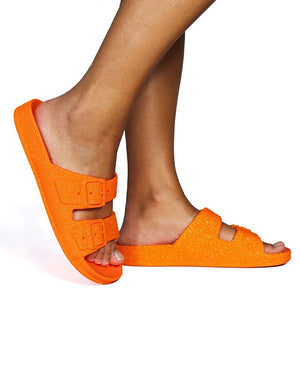 Une paire de sandales orange fluo à paillettes réalisée en PVC recyclé et recyclable de la marque Cacatoès. En plus d'avoir un look au top sur la plage, ces chaussures ont une odeur de bubble gum !