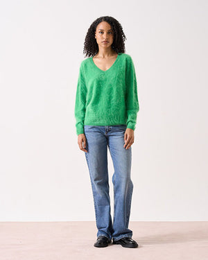 Le pull Soeli en cachemire tout doux et confortable arbore une couleur verte éclatante. On adore le col V de ce pull en cachemire brossé tout doux !