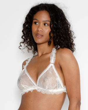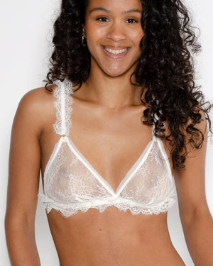 C'est une bralette triangle de chez Love stories. La dentelle est douce à inspiration florale. On est fan de ce modèle aussi fin et délicat, qui peut être parfait pour des dessous de mariage ou pour la vie de tous les jours !