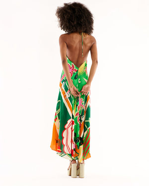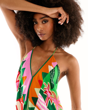 La robe Voila Chachacha représente l'été sur la French Riviera. Ce modèle évoque l'énergie des soirées estivales où les palmiers stylisés et les parasols à rayures créent un univers coloré et joyeux. Son décolleté profond et son noué derrière la nuque assurent un look féminin et élégant, tandis que sa longueur 7/8ème légèrement asymétrique offre un effet traîne parfait. Découvrez toute la collection Wild ici
