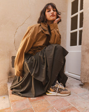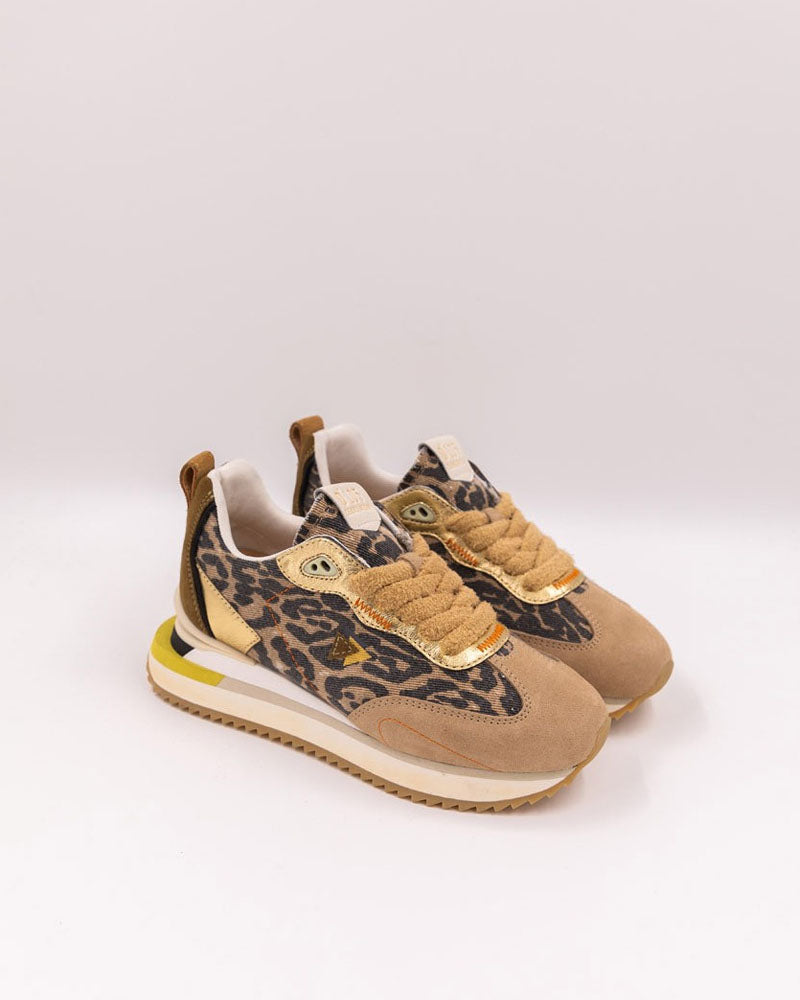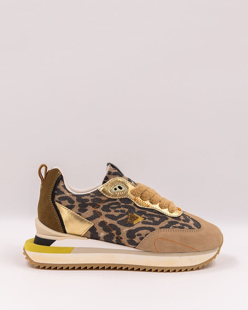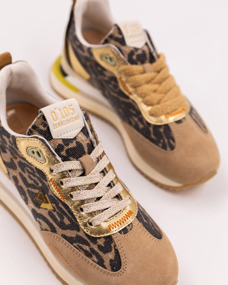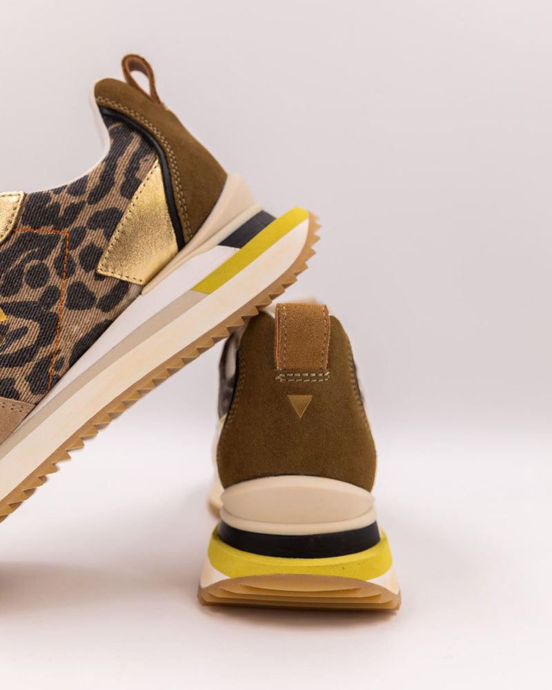 Empiècements en cuir doré / Surpiqûres orange contrastantes / Style urbain affirmé / Touche féminine et audacieuse / Confort optimal / Silhouette dynamique / Facile à porter