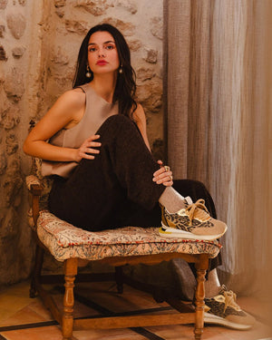 Empiècements en cuir doré / Surpiqûres orange contrastantes / Style urbain affirmé / Touche féminine et audacieuse / Confort optimal / Silhouette dynamique / Facile à porter