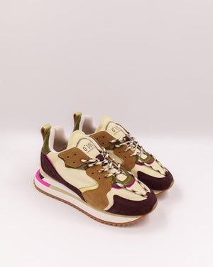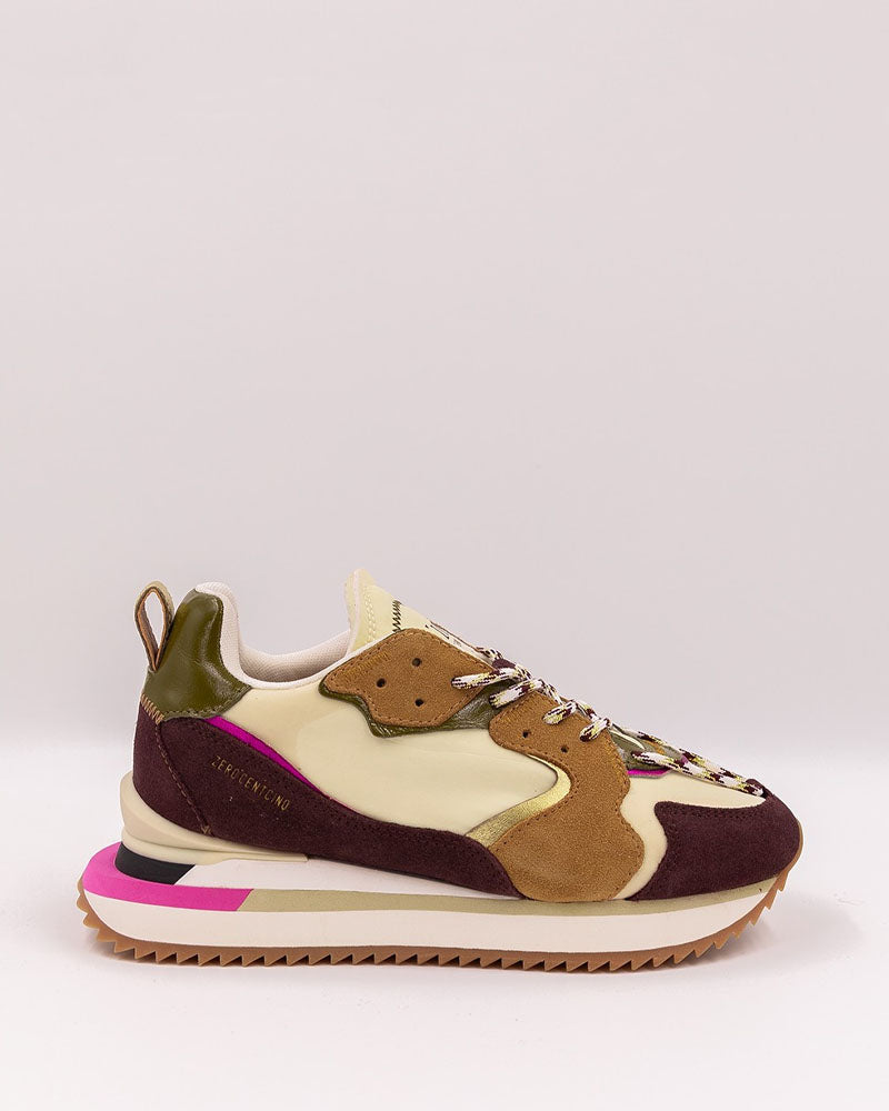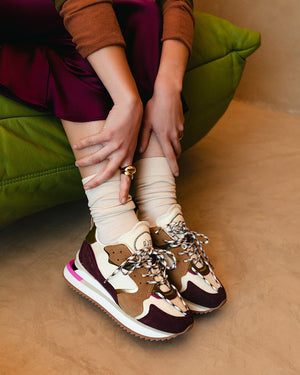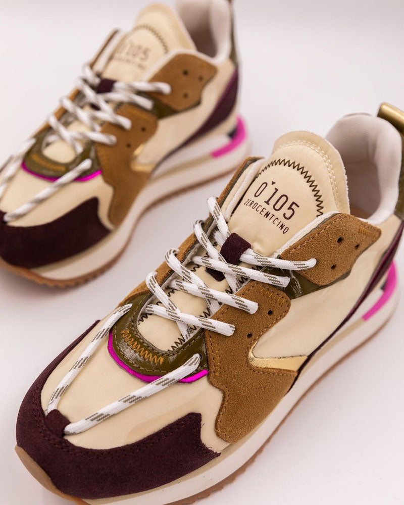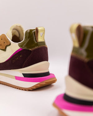 Base en nylon crème / Empiècements en suède bordeaux et tan / Détails en cuir vernis kaki / Touches de rose chaud / Contrastes harmonieux / Look chic et affirmé / Facile à porter