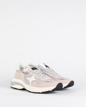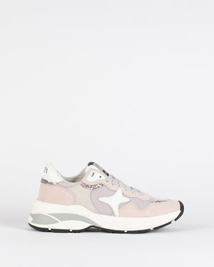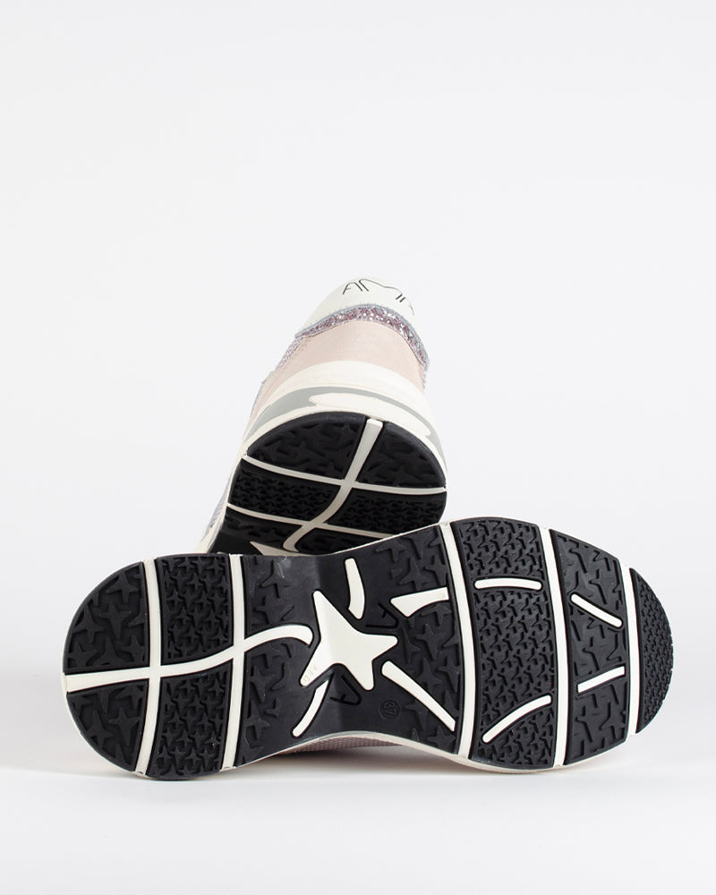 Une paire de baskets pour femme de la marque Ama Brand idéale pour la saison. Avec des touches de paillettes roses et sa semelle épaisse hyper confortable !