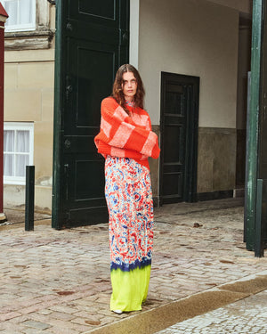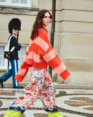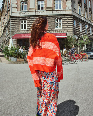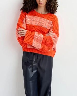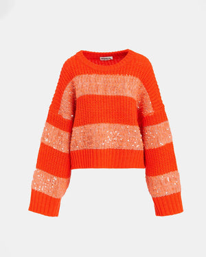 Un pull en maille et sequins corail pour femme de la marque Essentiel Antwerp. On adore ce pull en maille et en sequins pour femme, parfait pour briller de mille feux ! Les rayures de sequins sur la maille de ce pull couleur corail le rendent très tendance !
