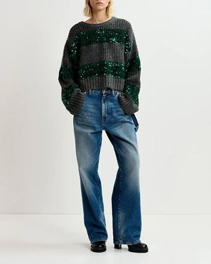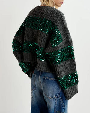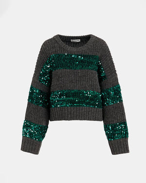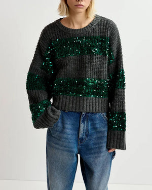 Un pull en maille et sequins gris pour femme de la marque Essentiel Antwerp. On adore ce pull en maille et en sequins pour femme, parfait pour briller de mille feux ! Les rayures de sequins sur la maille de ce pull gris le rendent très tendance !