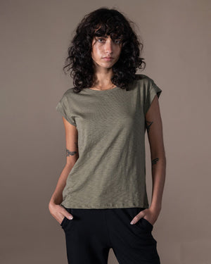 Tee-shirt col rond / décolleté en jersey / petites manches courtes / coupe droite.