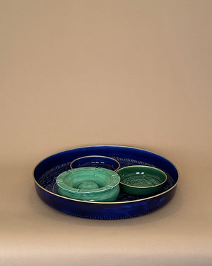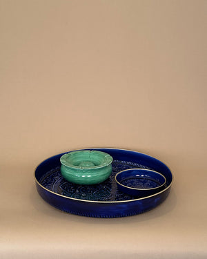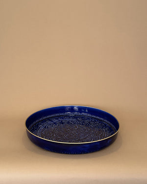 Un plateau de 50cm de diamètre de couleur bleu roi avec un relief ethnique. Vive la folie des grandeurs !
