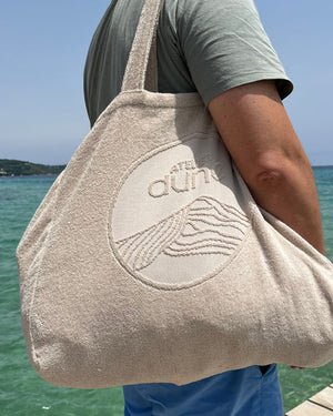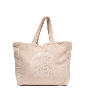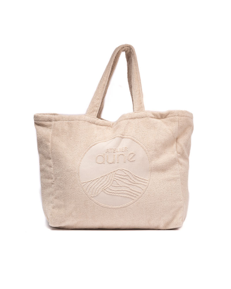 Un grand cabas en éponge bouclette de couleur beige et de la marque Atelier Dune. Ce grand cabas est idéale pour la saison, il est spacieux et tendance !