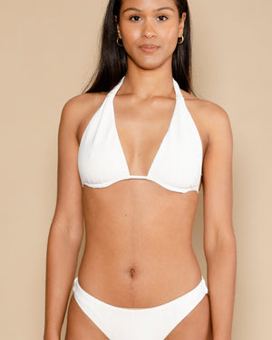 Le haut de maillot Lily de chez Baie Brune. On craque pour ce haut de maillot triangle blanc. Grâce à ses bagues ajustable, il peut se porté de trois façons : en triangle foulard, en bikini en baissant les bagues, et en bandeau en basculant le triangle ! Un maillot de bain tendance et haut de gamme.