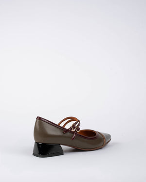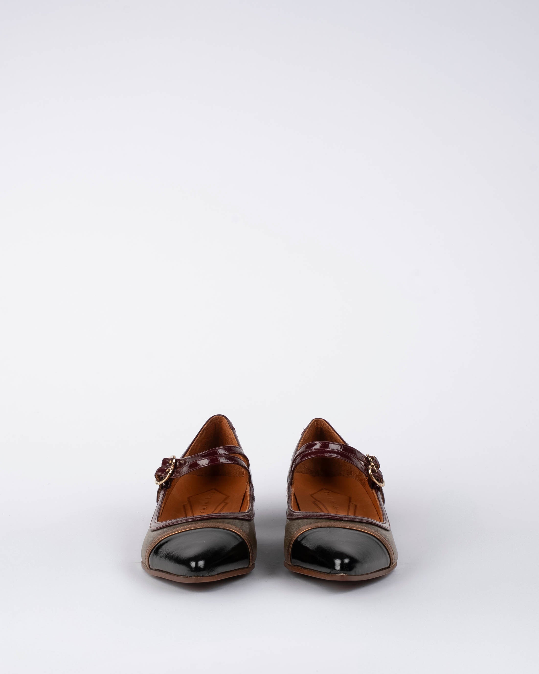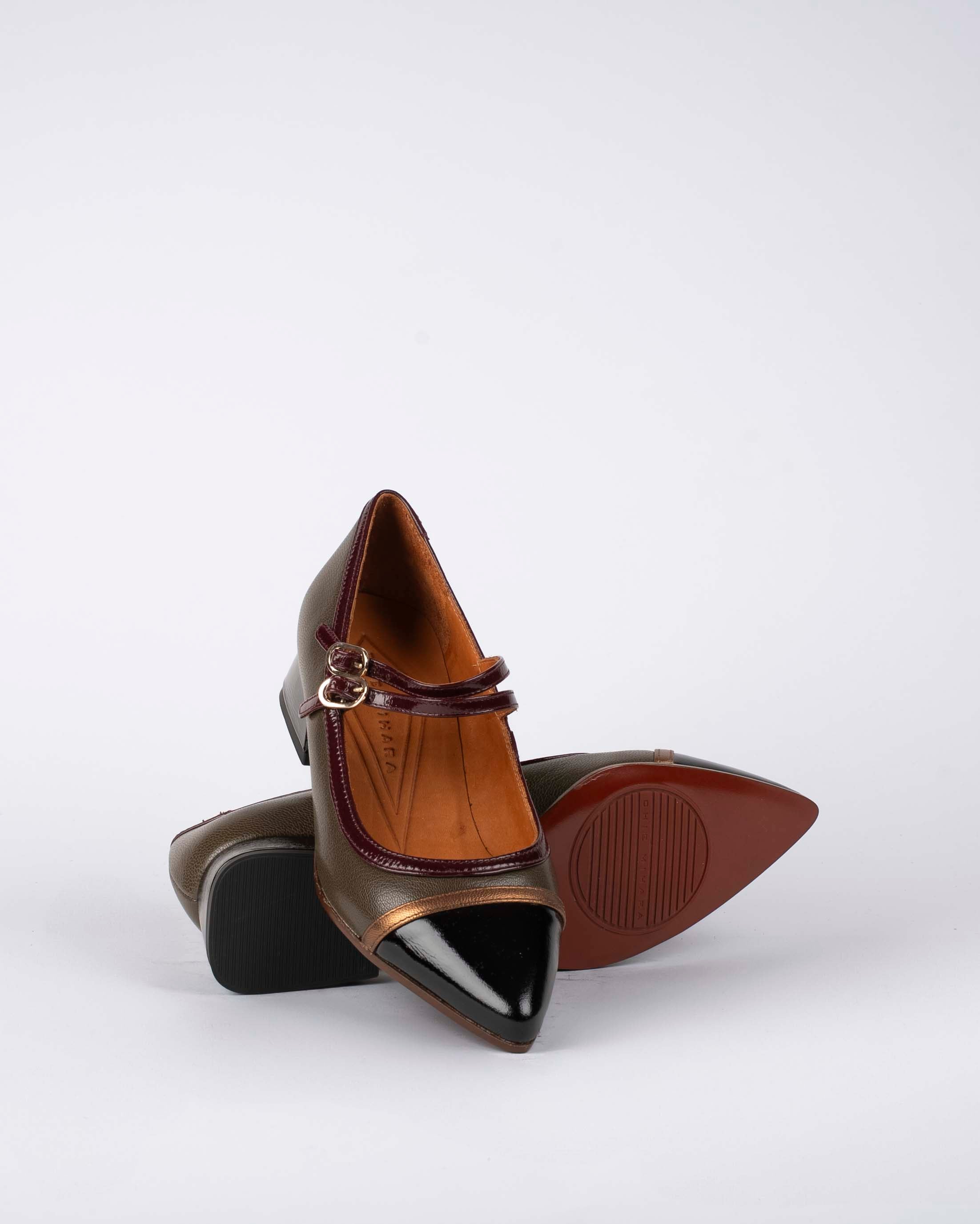Ballerines Chie Mihara / Cuir lisse kaki, noir et bordeaux / Double bride élégante / Style graphique et raffiné