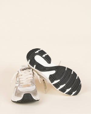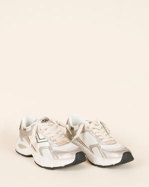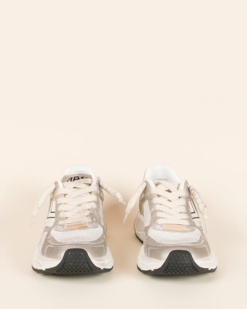 Baskets femme / style running / coloris argent / détails blanc et beige / lacets écru / bout renforcé / semelle épaisse