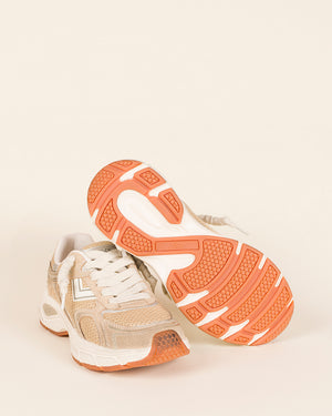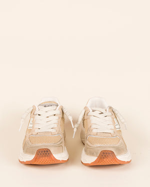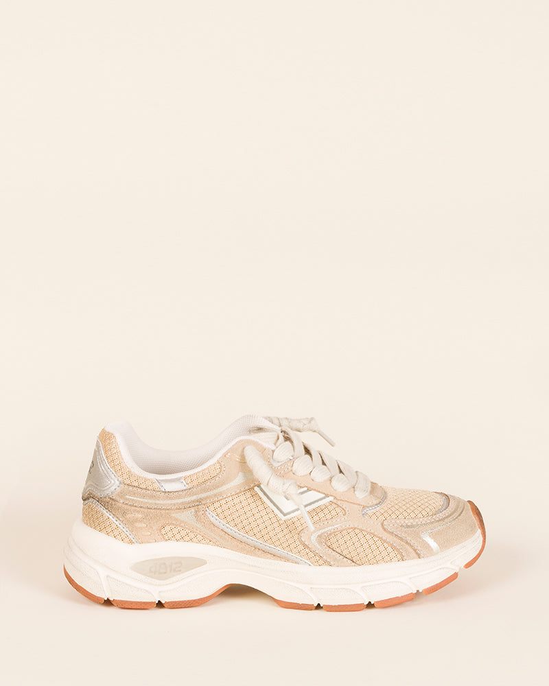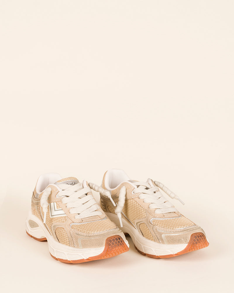 Baskets femme / modèle running / empiècements cuir et suédine / lacets coton écru / coloris beige, écru, blanc