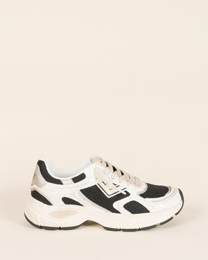 Baskets femme / lacets blancs / empiècements cuir et textile / semelle épaisse / coloris blanc, noir, gris