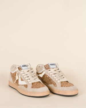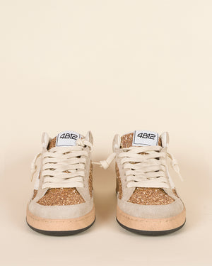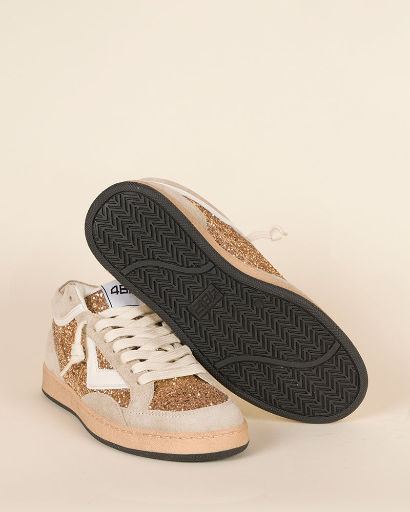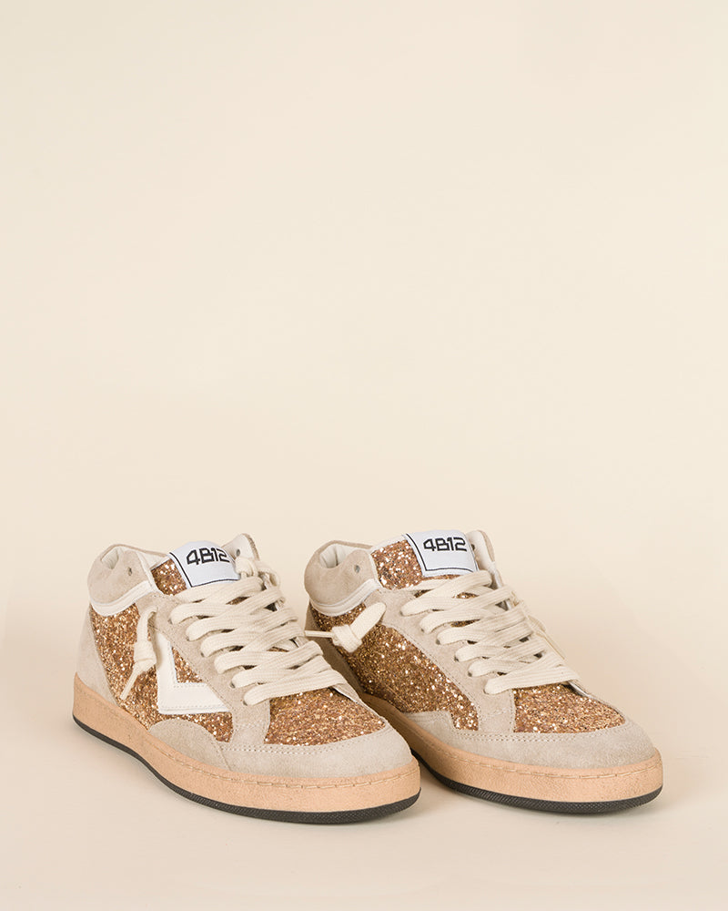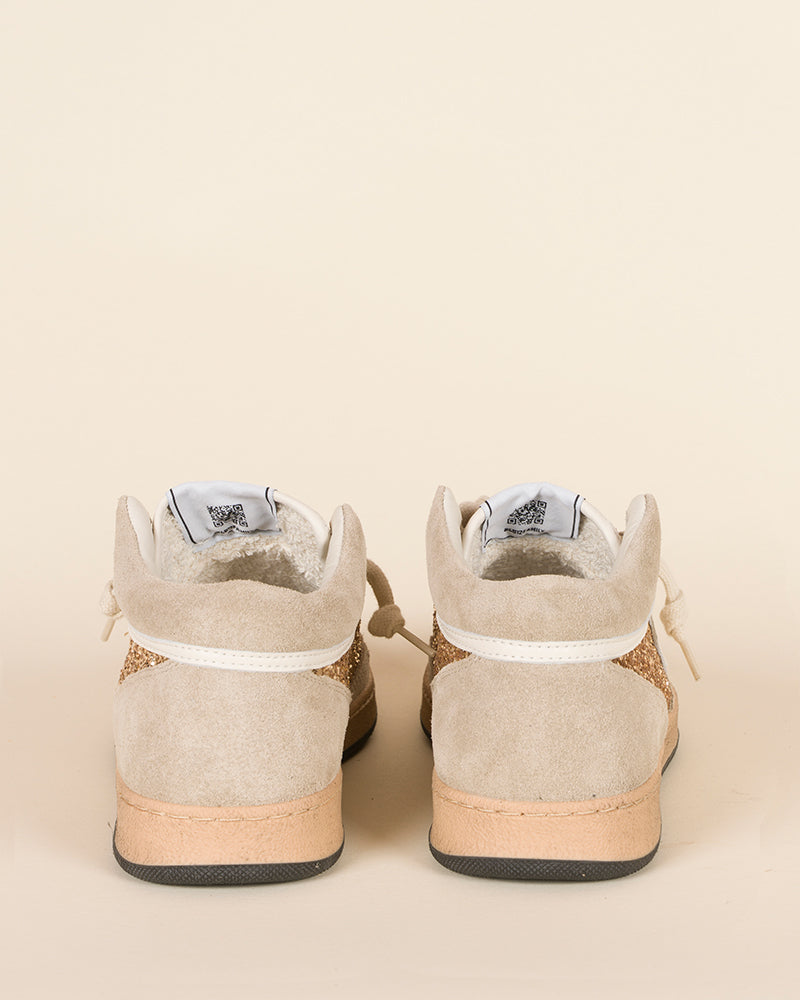 baskets femme / modèle mid / cuir beige / empiècements pailletés dorés latéraux et avant / lacets écru / semelle plate
