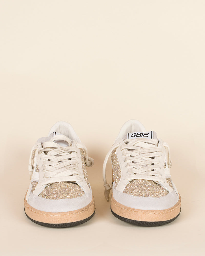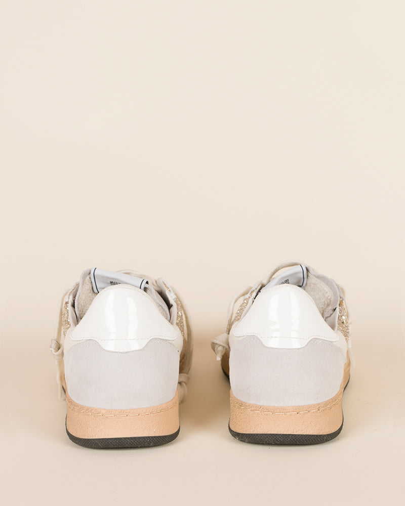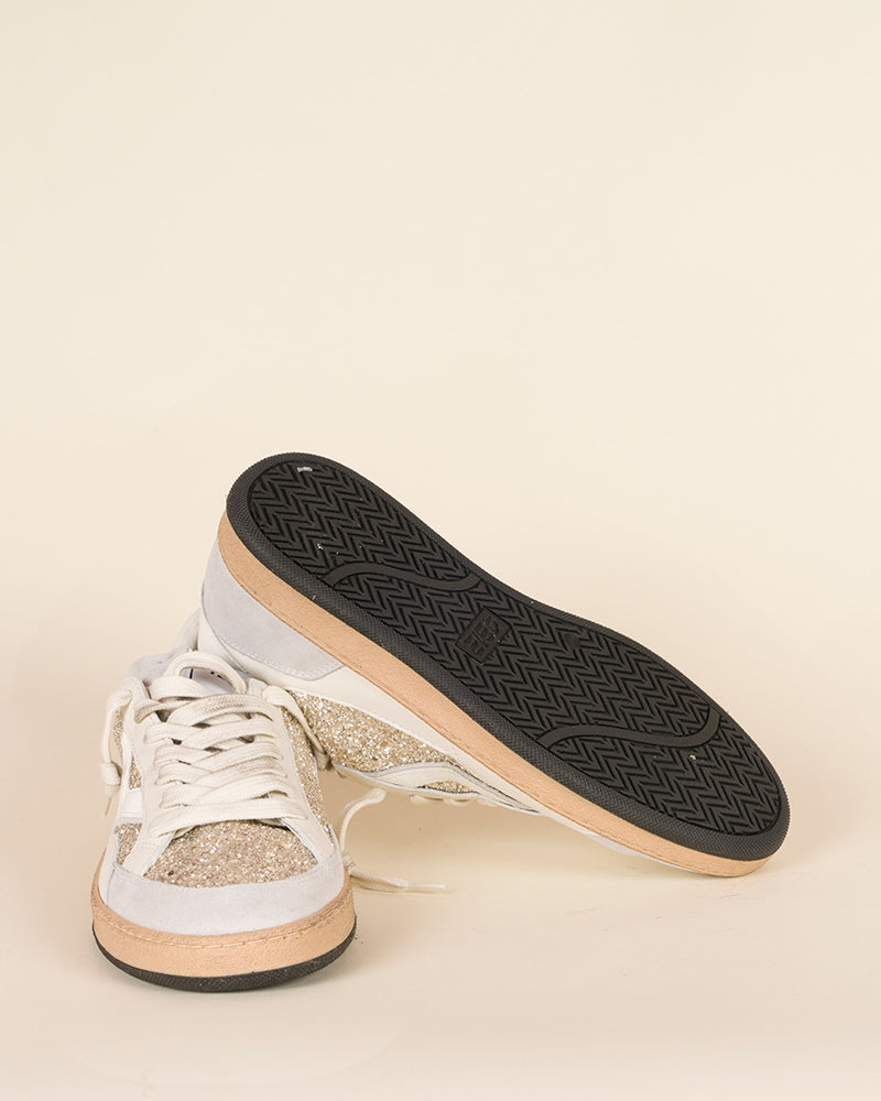 baskets femme / cuir blanc et or / lacets écru / semelle plate