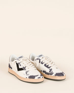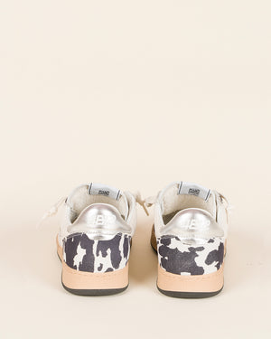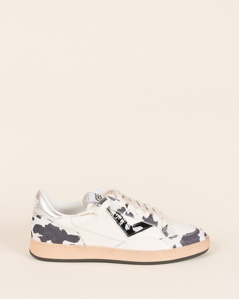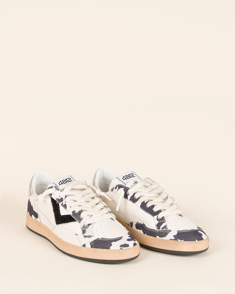 baskets femme / cuir blanc / imprimé vache noir et blanc / lacets écru / talon argent métallisé / semelle plate