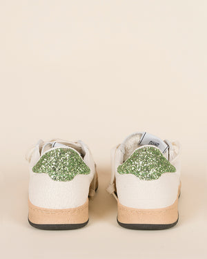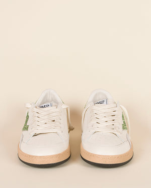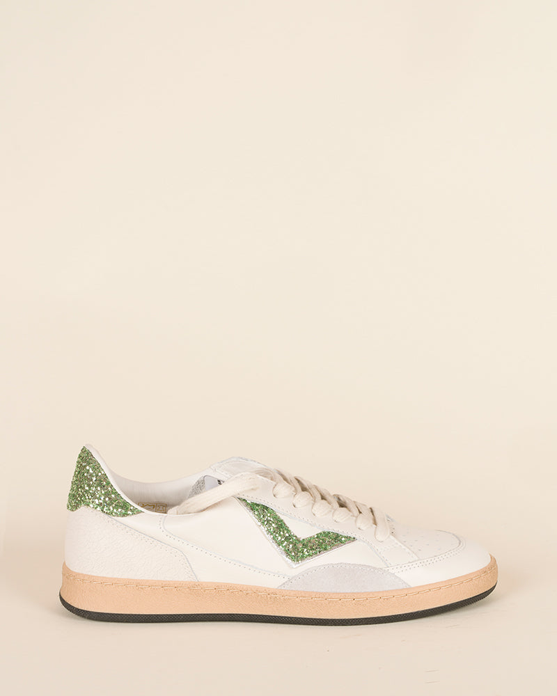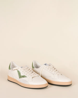 baskets femme / cuir blanc / paillettes vertes / lacets écru / semelle plate