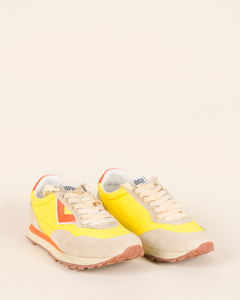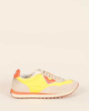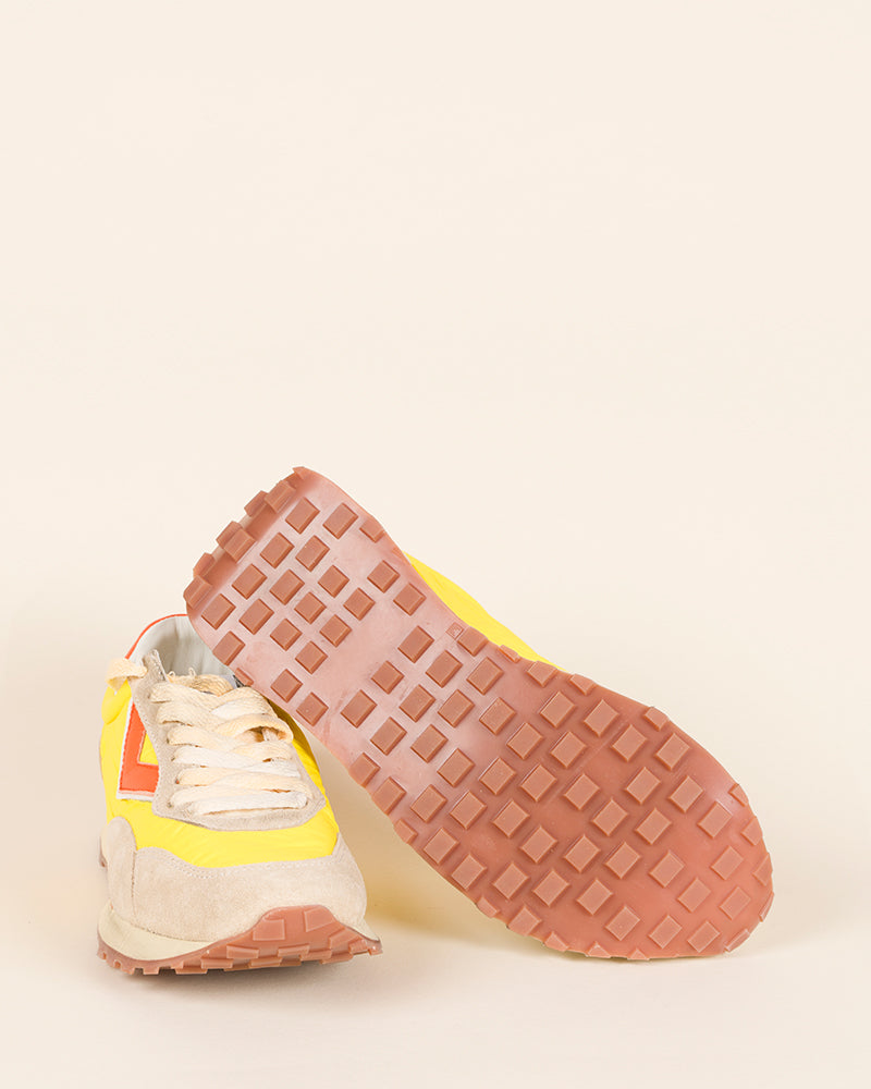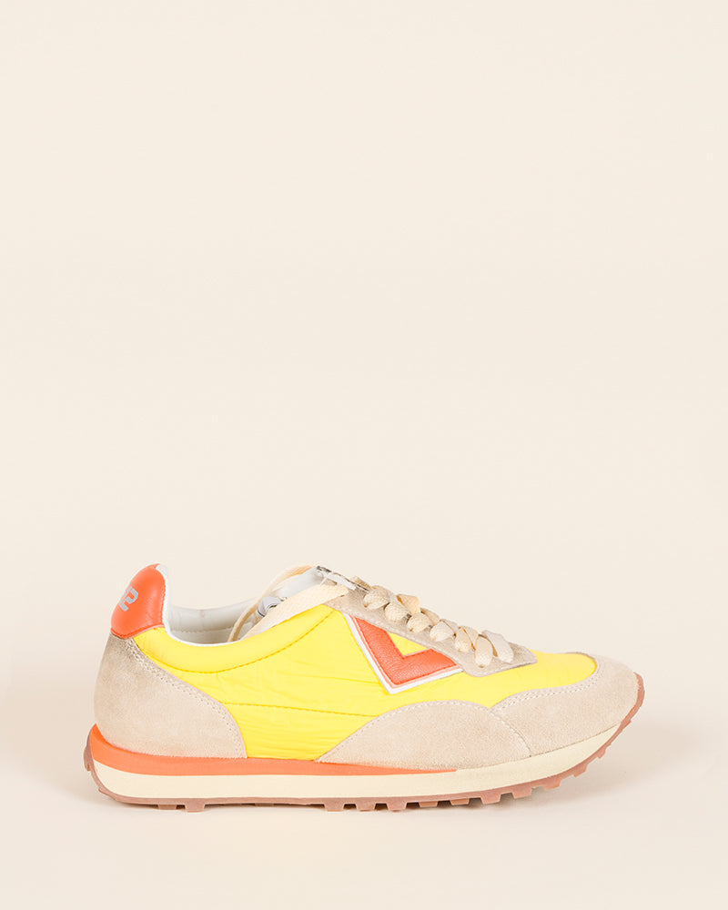 baskets femme / style running rétro / textile jaune / empiècements suédine beige / détails orange / lacets écru / semelle épaisse