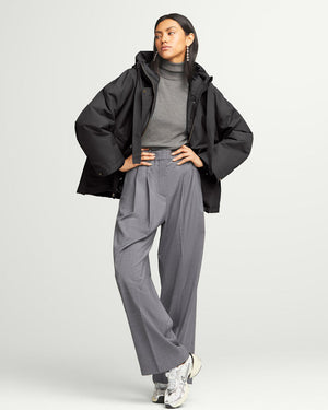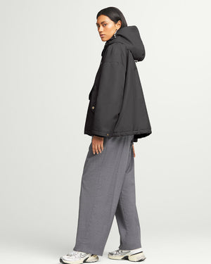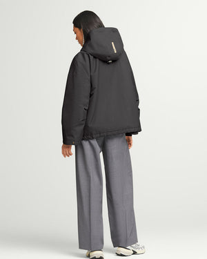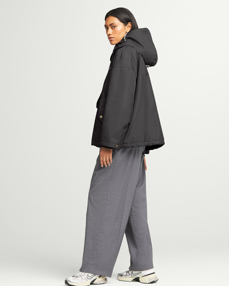 Veste boxy mi-longue / Tissu technique effet soie 2 couches / Imperméable, coupe-vent, respirante / Capuche ajustable / Ourlet ajustable / Poches à rabat doublées polaire / Poche intérieure zippée / Se porte oversize