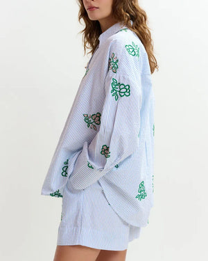 Chemise brodée Essentiel Antwerp / coupe oversize / rayures fines bleu & blanc / broderies fleurs contrastées / col classique / poignets boutonnés / look décontracté chic