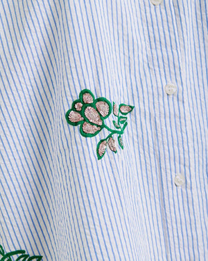 Chemise brodée Essentiel Antwerp / coupe oversize / rayures fines bleu & blanc / broderies fleurs contrastées / col classique / poignets boutonnés / look décontracté chic