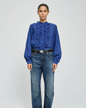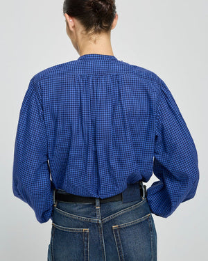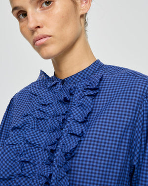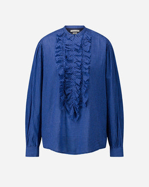 Motif vichy / coton léger et fluide / col mao orné d’un plastron à volants / manches longues à poignets boutonnés / coupe droite légèrement oversize