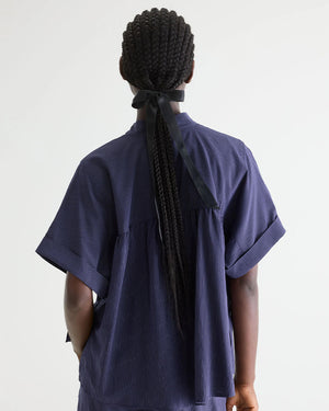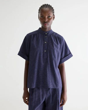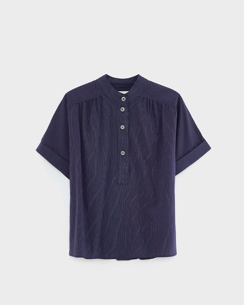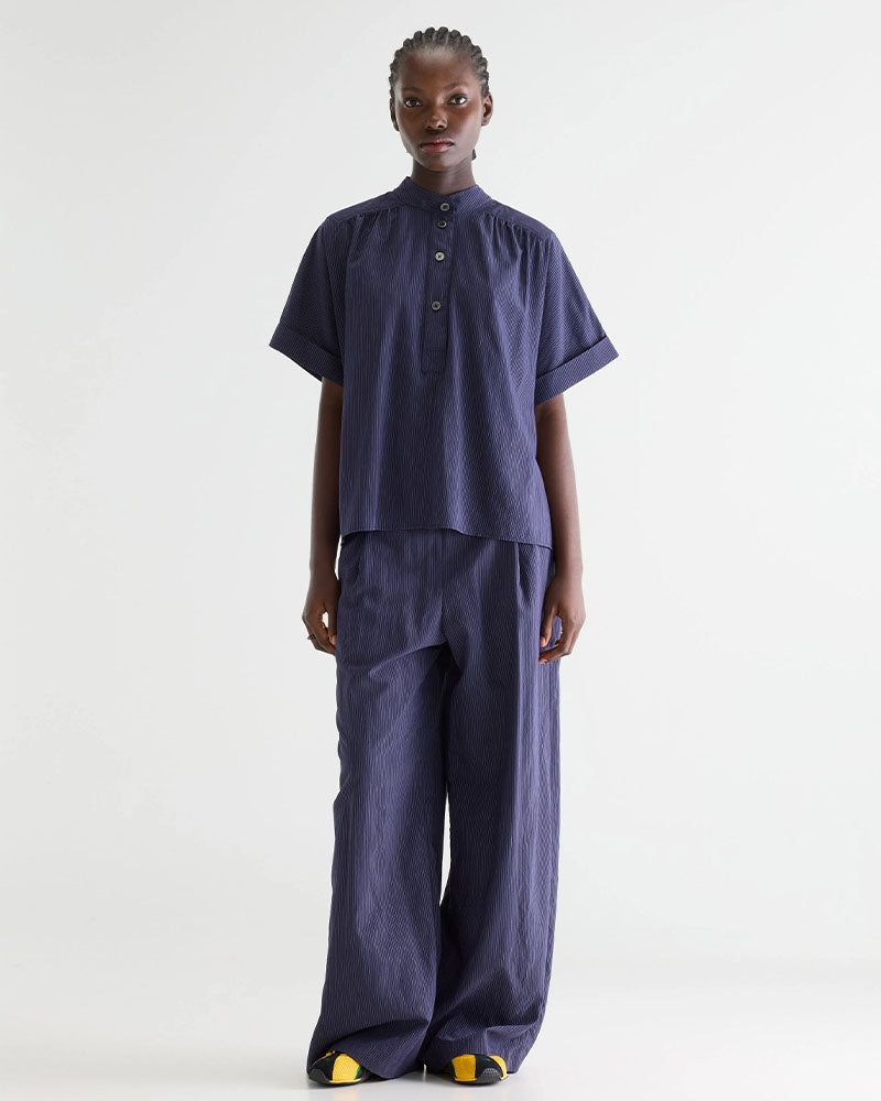 Coupe classique / Col montant semi-ouvert / Manches courtes à bords repliés / Détails froncés / Ourlet droit avec fentes latérales / Ensemble assorti avec le pantalon large Vespa