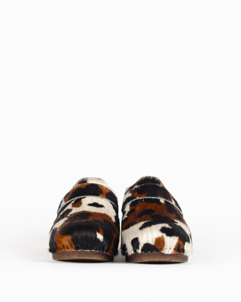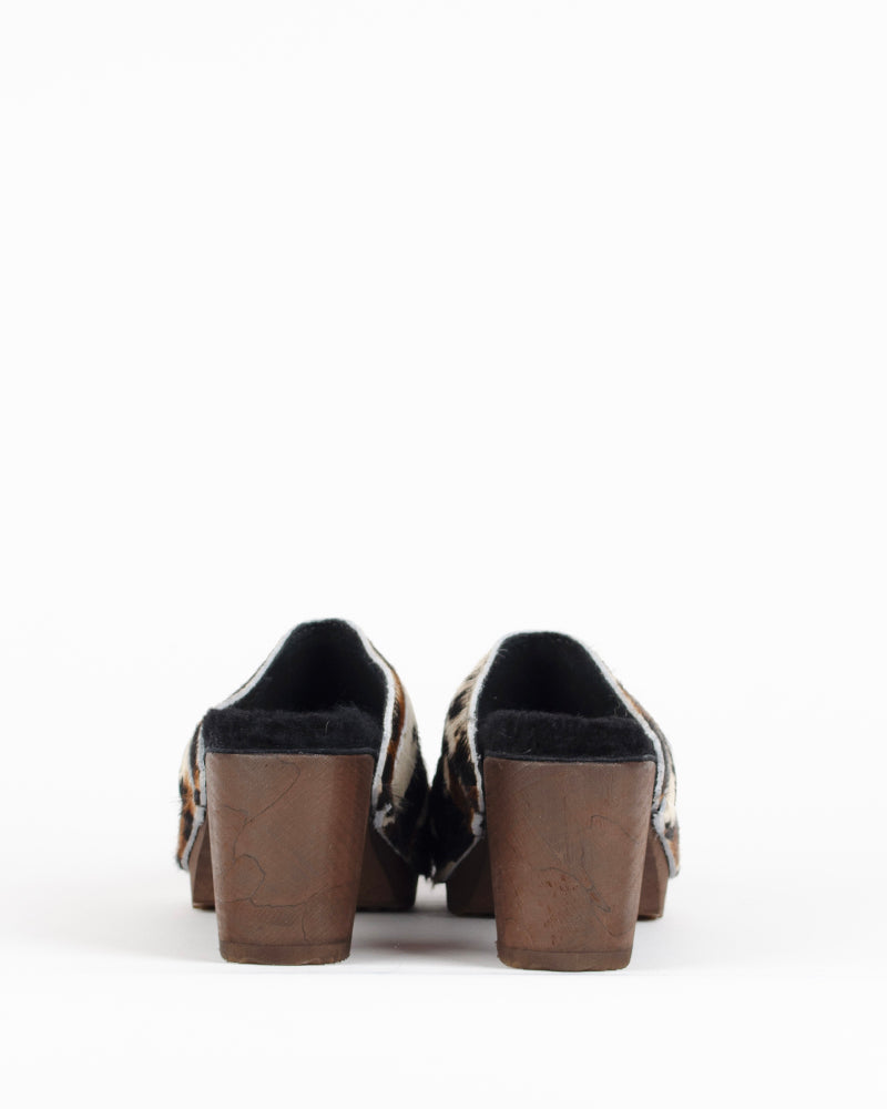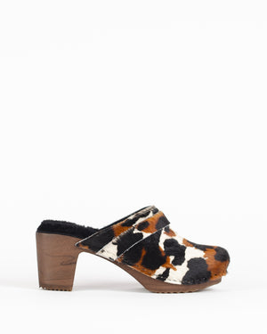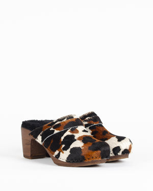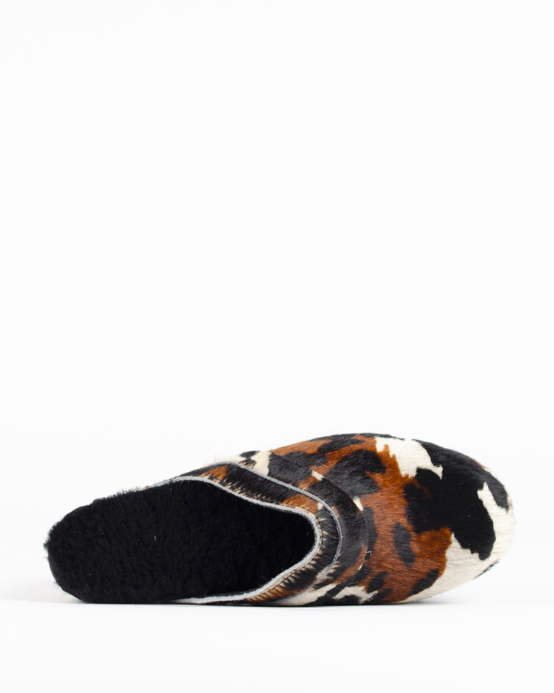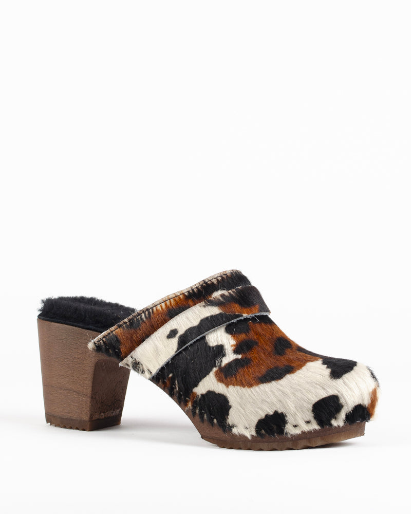 Sabots Ketya Bosabo à talons / Coupe mule ouverte / Imprimé vache à poil original / Talon confortable en bois / Intérieur doublé de moumoute marron chaude et douce