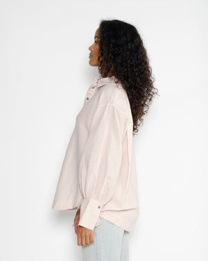 Une chemise nude intemporelle qui est une pièce indispensable, facile à assortir avec vos autres pièces de votre dressing. La coupe est ample avec les manches resserrées au niveau des poignets, ce qui rend la manche bouffante.