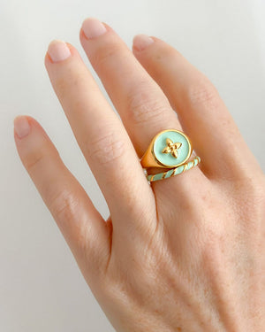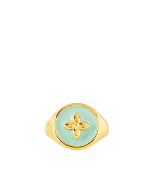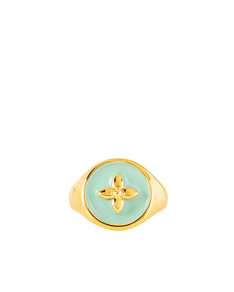 Chevalière de chez Cabirol. Cette bague est inspirée des fleurs solaires près de Nice baptisées Croisette de printemps. La créatrice a décliné son souvenir d'enfance sur la première chevalière Cabirol.