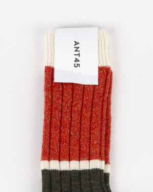 Chaussettes ANT45 / Maille côtelée / Longueur mi-haute / Logo ANT45 sur la semelle / Coloris bicolore rouge chiné et kaki avec détails crème au talon, à la pointe et au revers