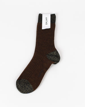 Chaussettes ANT45 / Maille côtelée / Longueur mi-haute / Logo ANT45 sur la semelle / Coloris chocolat avec talon, pointe et bord côte métallisés
