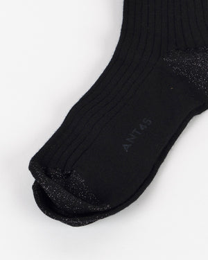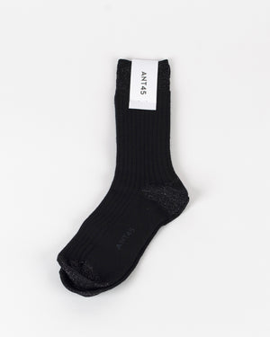 Chaussettes ANT45 / Maille côtelée / Mi-haute / Logo ANT45 sur la semelle / Coloris noir avec détails pailletés sur pointe, talon et revers