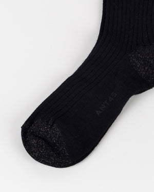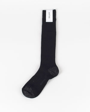 Chaussettes ANT45 / Maille côtelée / Longueur haute / Logo ANT45 sur la semelle / Coloris noir avec détails pailletés sur pointe, talon et revers