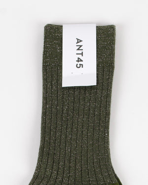 Chaussettes ANT45 / Maille côtelée / Longueur mi-haute / Logo ANT45 sur la semelle / Coloris kaki pailletés avec pointe et talon contrastés vert
