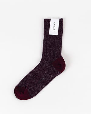 Chaussettes ANT45 / Maille côtelée / Longueur mi-haute / Logo ANT45 sur la semelle / Coloris pailletés avec pointe et talon contrastés bordeaux