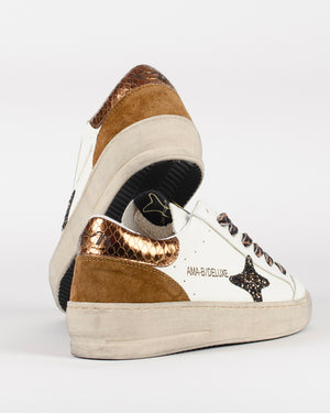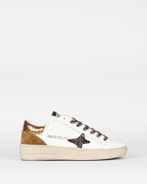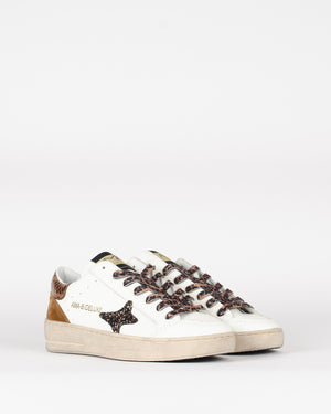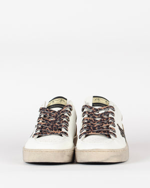 Les baskets Slam blanches / basse et plate / illuminée par des détails à paillettes dorées et des lacets imprimés léopard / look chic et sauvage / Confortables / originales