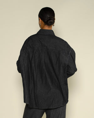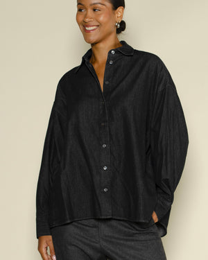 Coupe oversize / Texture douce et légèrement transparente / Poche poitrine avec surpiqûre diagonale signature / Boutons en nacre / Ourlet arrondi / Pli creux au dos / Fabriquée au Portugal