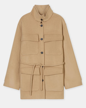 Coupe droite / Col double / Poches à rabat / Pattes boutonnées aux manches / Ceinture corde / Fabriquée en Roumanie