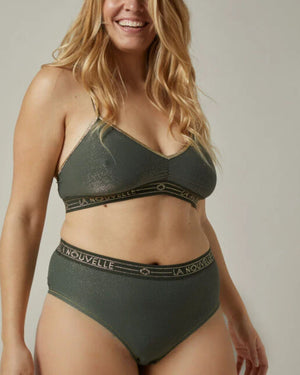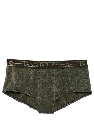Un shorty de couleur kaki de la marque La Nouvelle. On est complètement fan de cette pièce de lingerie aux détails dorés. On craque pour le confort de cette culotte !